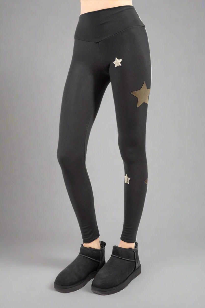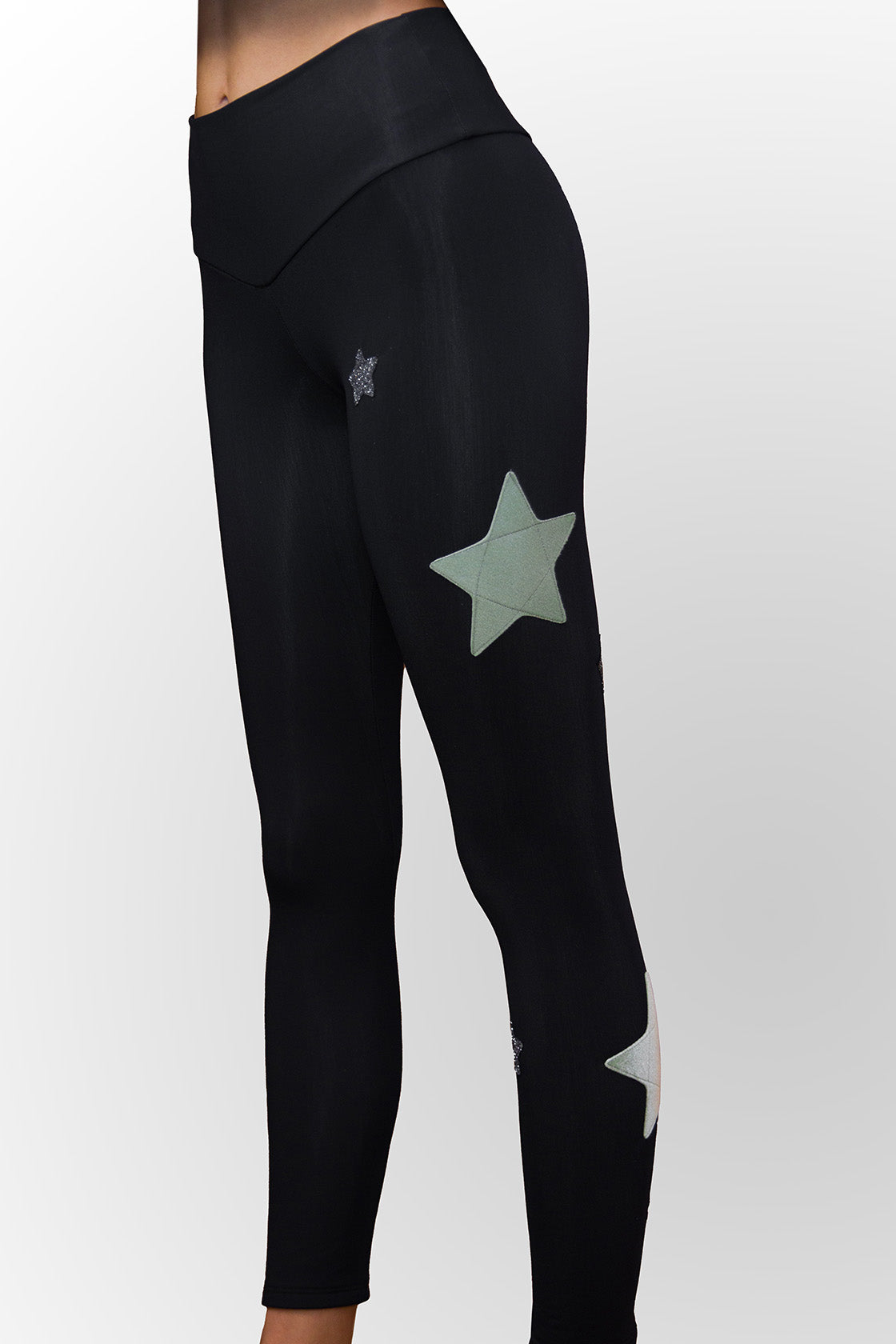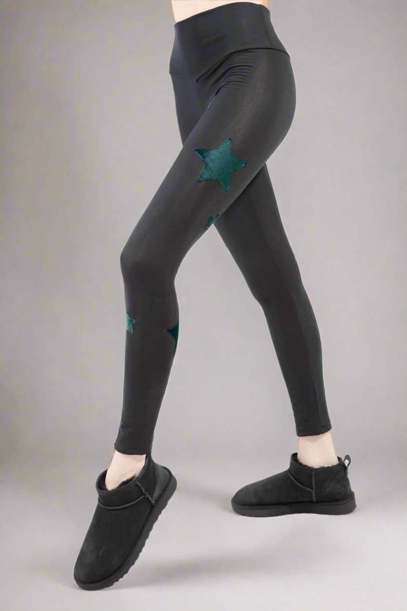 Leggings in black superior lycra, fleece on the inside, high waist, details with black velvet stars with lurex and silver, perfect for autumn and winter days.