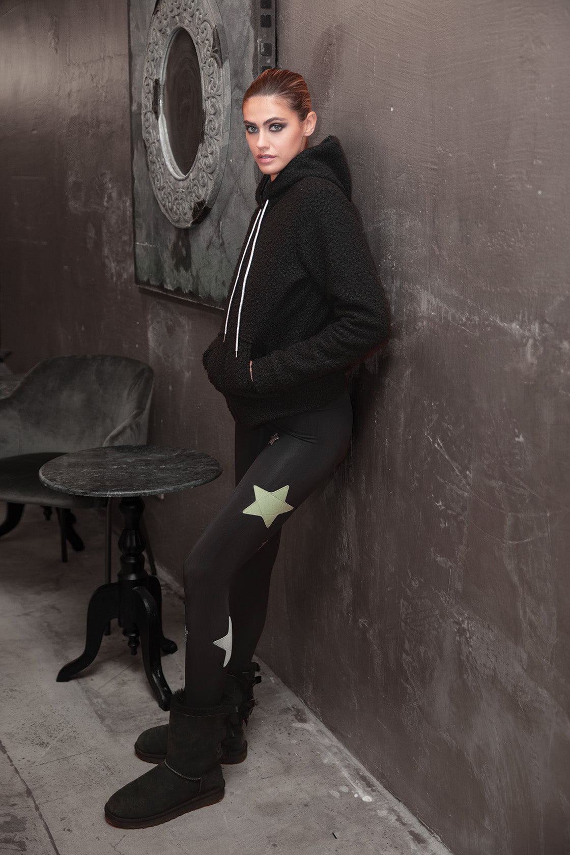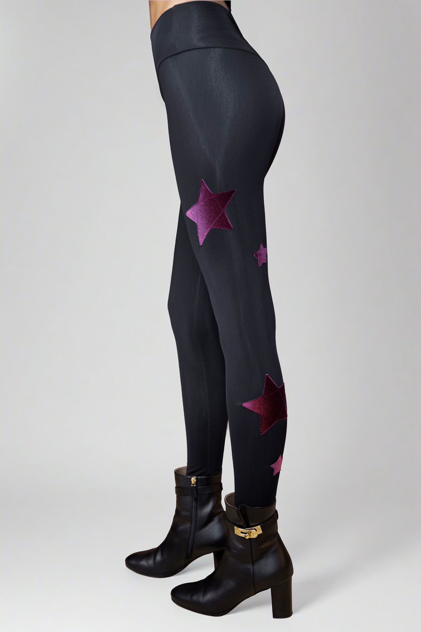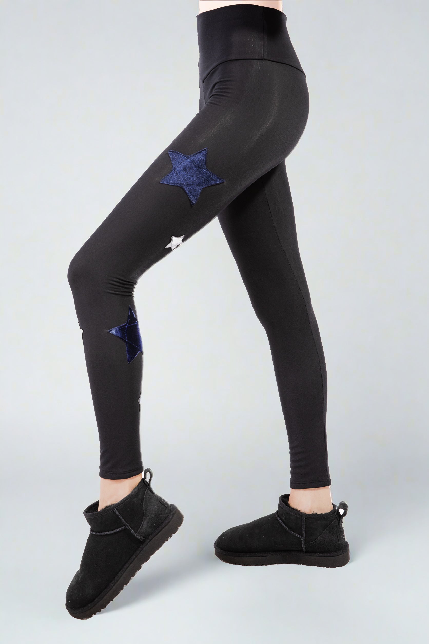 Leggings in black superior lycra, fleece on the inside, high waist, details with black velvet stars with lurex and silver, perfect for autumn and winter days.