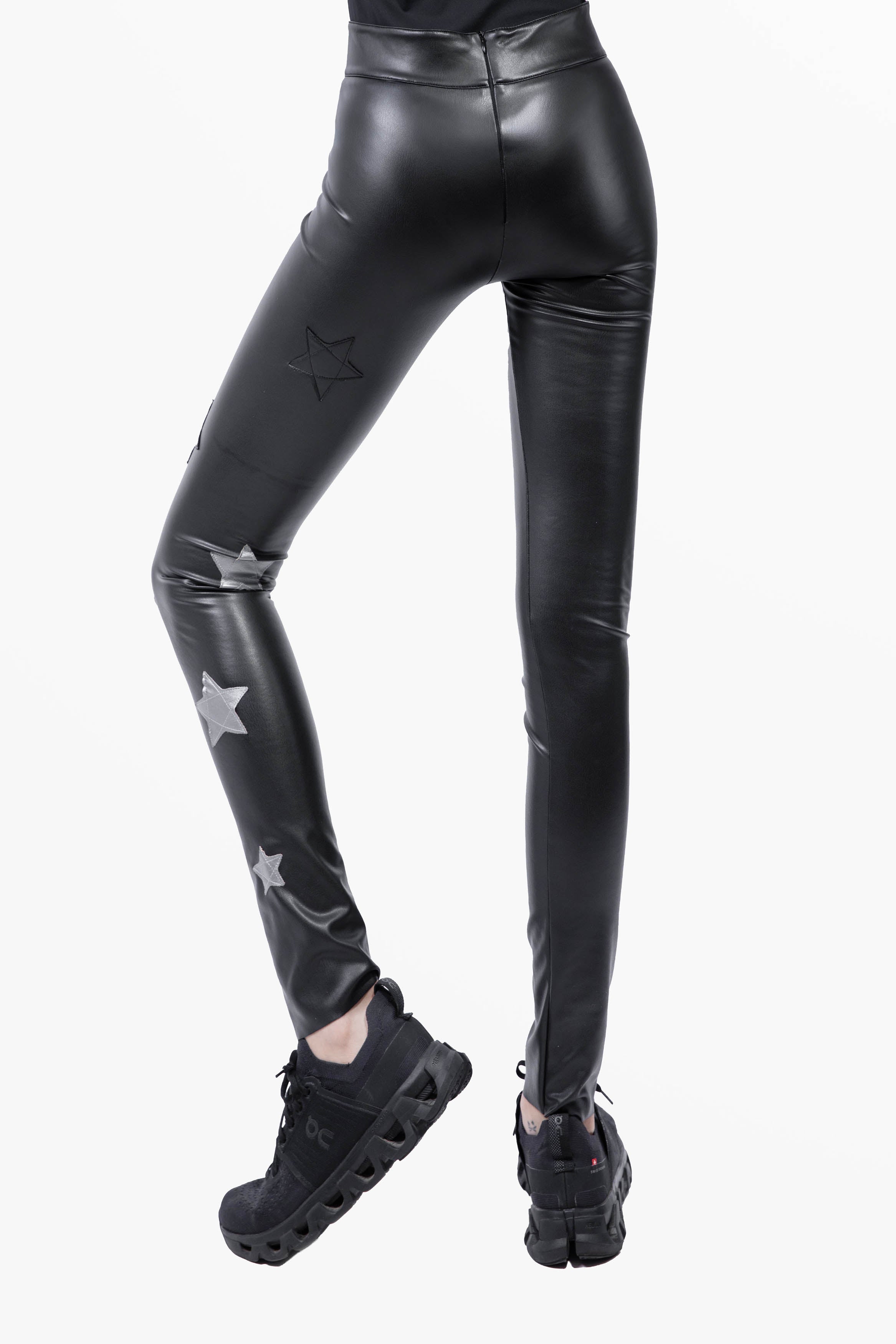 Leggings in stretch black eco-leather with a glossy, elegant finish. The slim fit enhances the silhouette, while the tone-on-tone snakeskin-style star applications add character and uniqueness to the piece. Perfect for evening looks or bold outfits, easily paired with elegant tops or oversized sweaters for a casual-chic style.