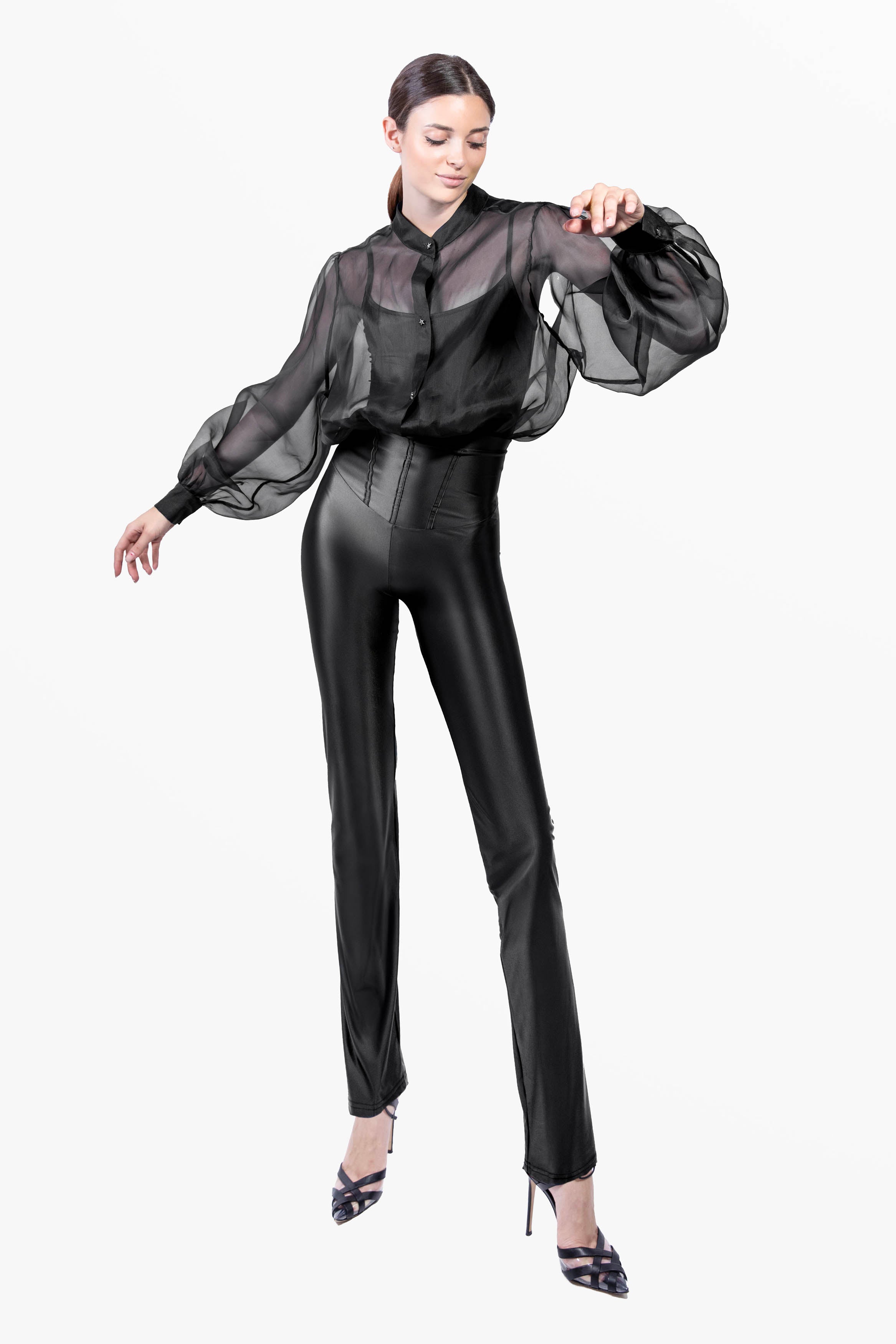 Lightness and mystery intertwine in Odile, the new trouser in structured silk-effect Lycra. A perfect balance of stretch and softness that gracefully hugs the silhouette.