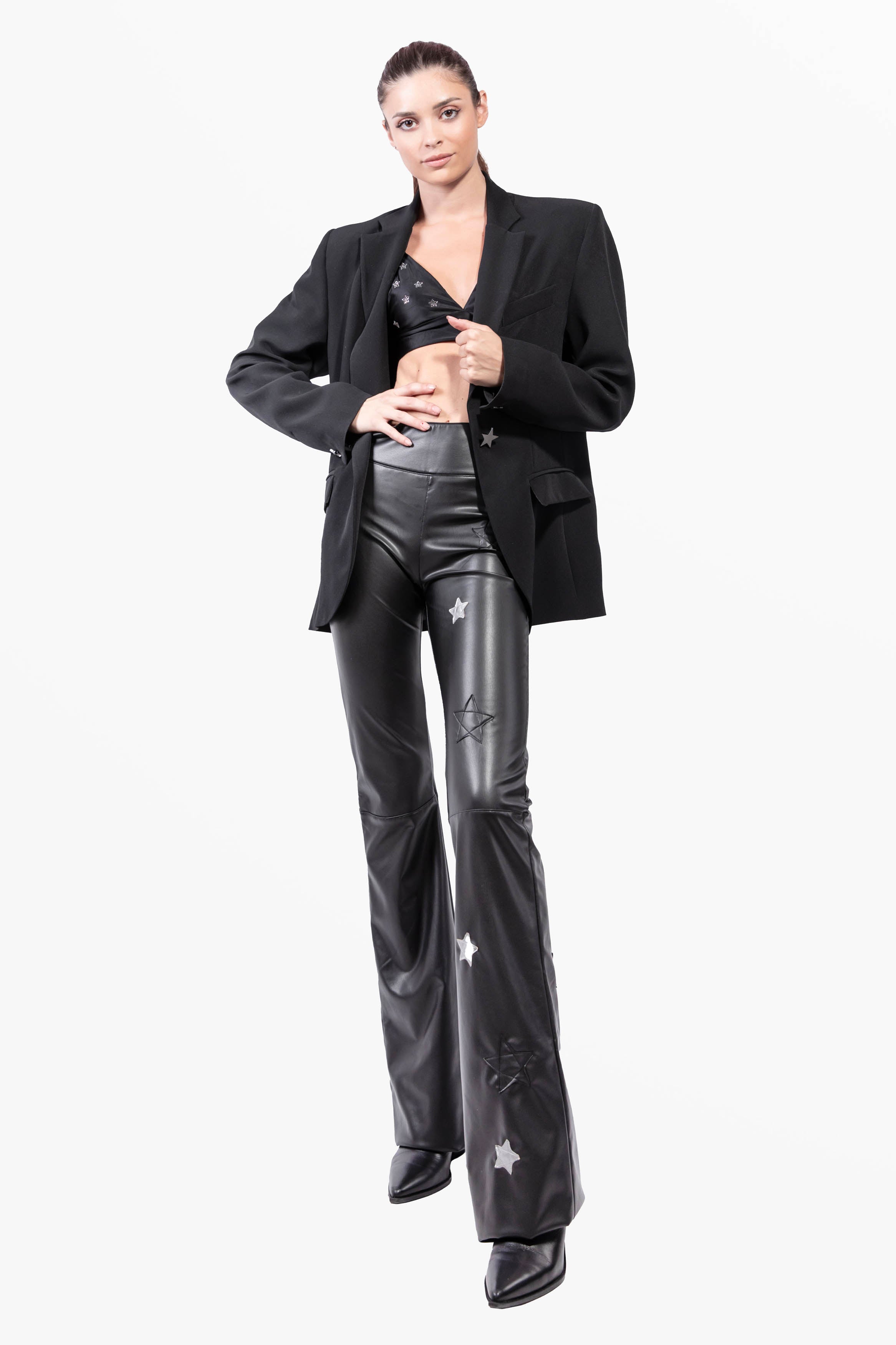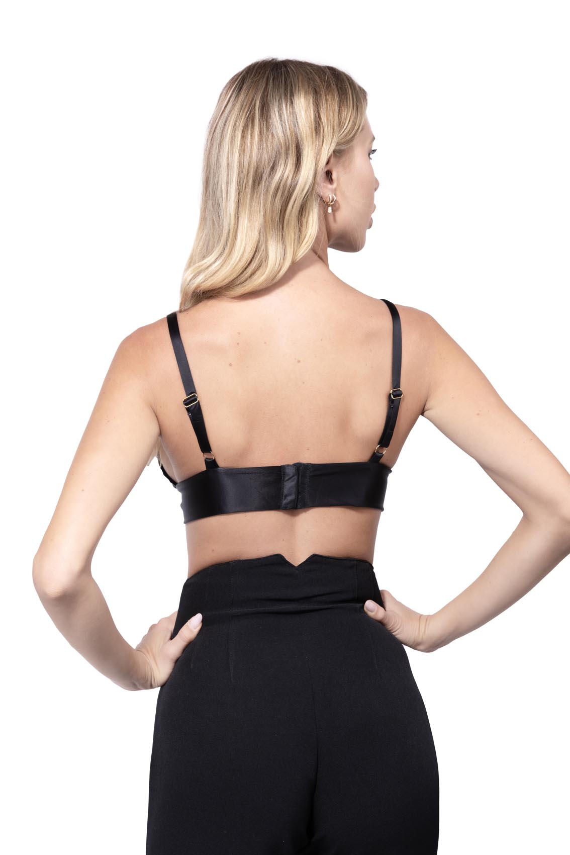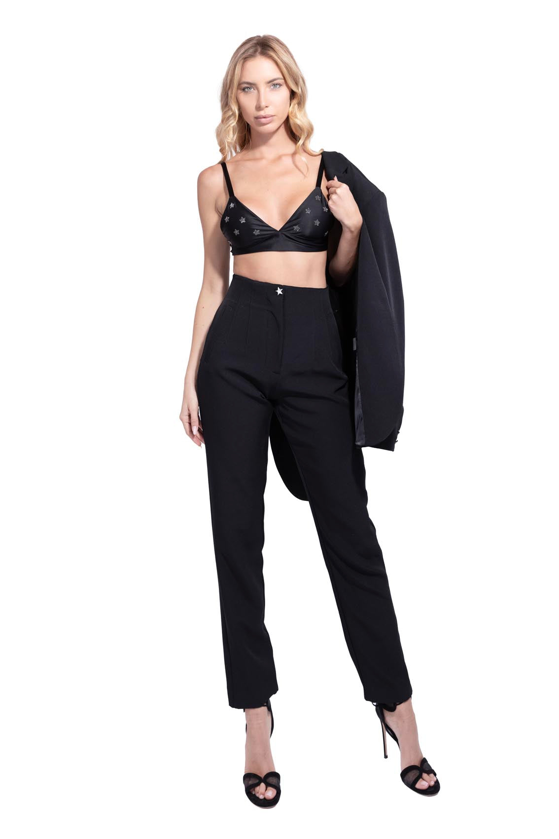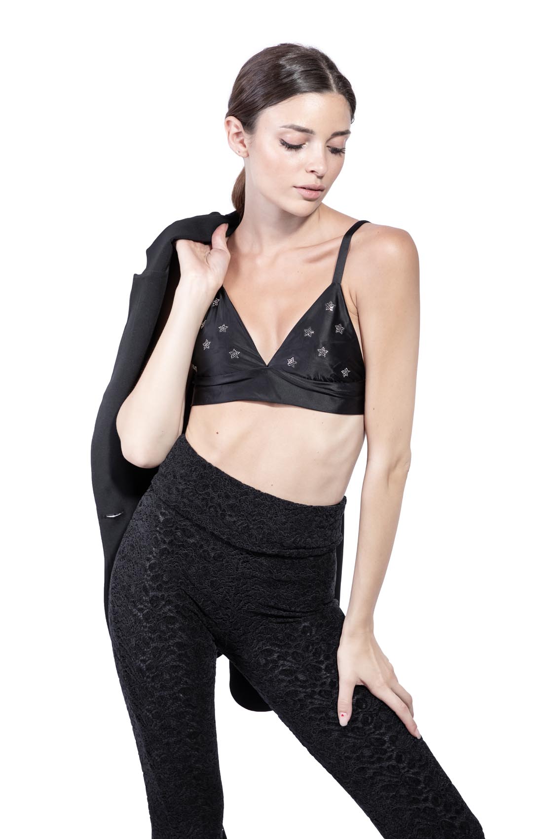 Black silk-touch Lycra bra with triangle cups and star applications. Adjustable straps and a back hook closure ensure support and a perfect fit. Designed to be worn as refined lingerie or as a chic top paired with blazers and high-waisted trousers.